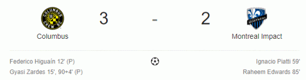 Formazione: Bush; Petrasso, Cabrera, Raitala, Lovitz; Piette, Taïder, Krolicki, Jeisson Vargas (Edwards 66′), Piatti; Mancosu A disposizione e non utilizzati: Diop, Fanni, Duvall, Béland-Goyette, Oduro, Donadel Reti: CLB – Higuaín (R) 12′ CLB – Zardes 15′ MTL – Piatti 59′ MTL…