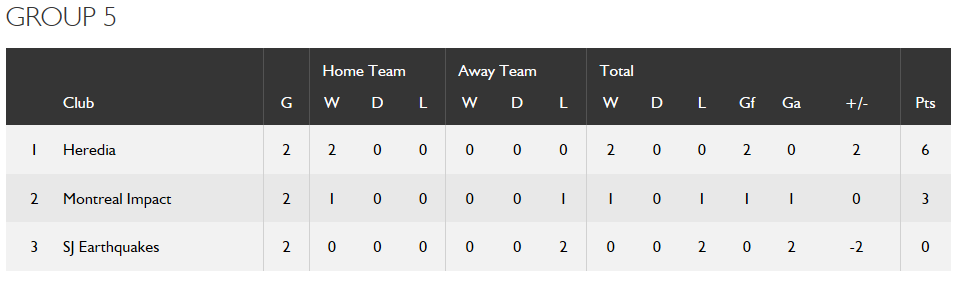 Montreal occupa il secondo posto del Gruppo 5 mentre San Jose non ha ancora smosso la sua classifica, avendo perso entrambe le partite disputate sin qui. Il club guatemalteco Heredia è in testa al gruppo a punteggio pieno, avendo sfruttato al meglio le due partite giocate in casa.
