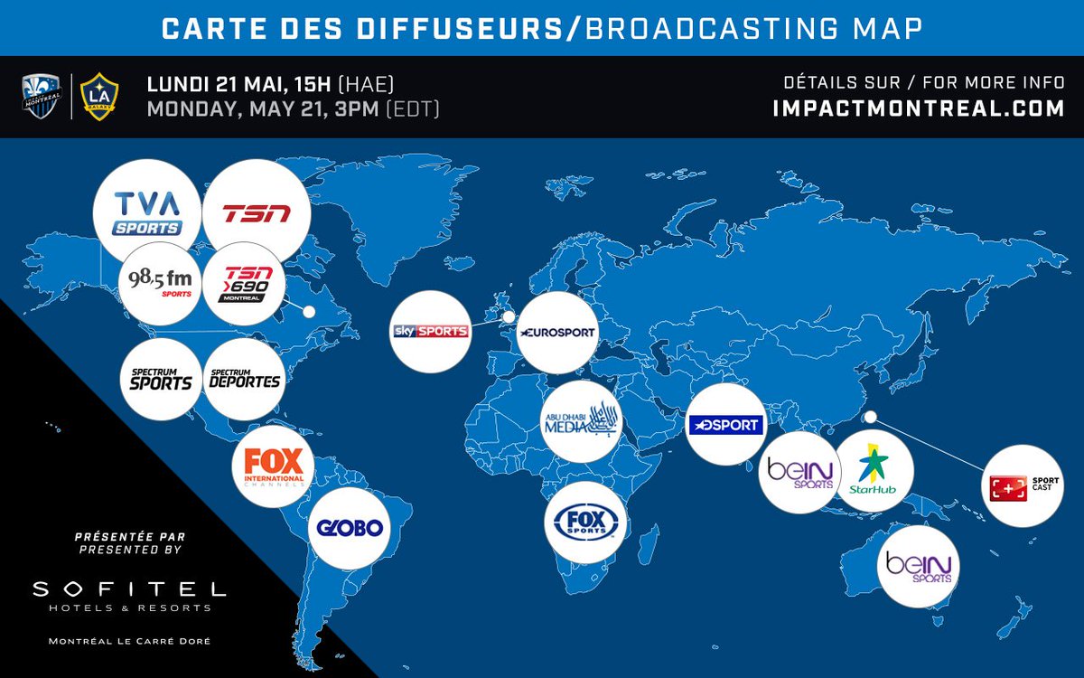 Calcio d’inizio alle ore 15:00 e la partita sarà diffusa localmente da TVA Sports, TSN, 98,5fm, TSN Radio 690 e sarà possibile visionarla anche altrove nel mondo: